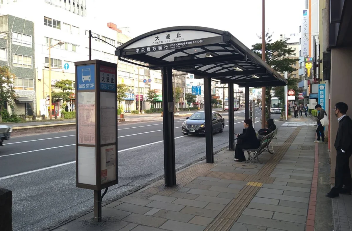 福岡行のりばは、中央橋方面行バス停です。(付近にファミリーマート、西日本シティ銀行があります)